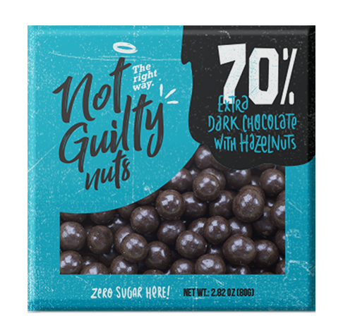 Avelãs cobertas com chocolate negro. Contém edulcorante. |